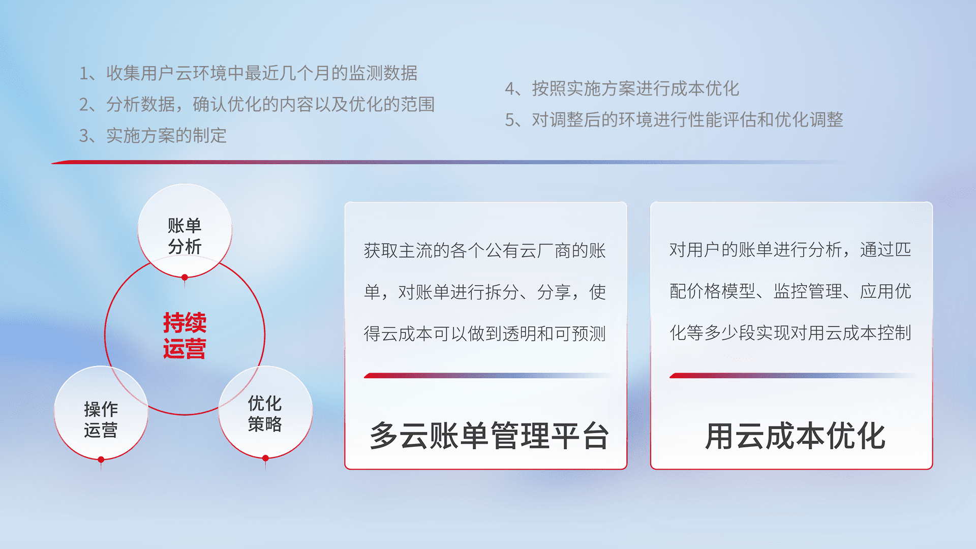 通过多云纳管,,,,以统一的资源数据模型把客户的云资源进行抽象和封装,,进而实现对多云资源的统一操作,,,,保障云资源管理的可靠性、、、稳定性与可用性。。量身定制化运维内容,,,配置、、、、开发运维、、补丁管理、、备份、、、监控、、认证和访问管理、、、审计和日常巡检等,,,保障在用云过程中的可靠度,,,稳定度以及高可用率。。